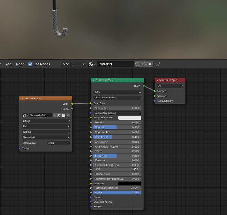 Then I just threw a simple Material together using the UVGrid as Image Input. Using the grid is really useful to see places where your future textures might stretch in a ugly manner or get cut by seams in unwanted locations.