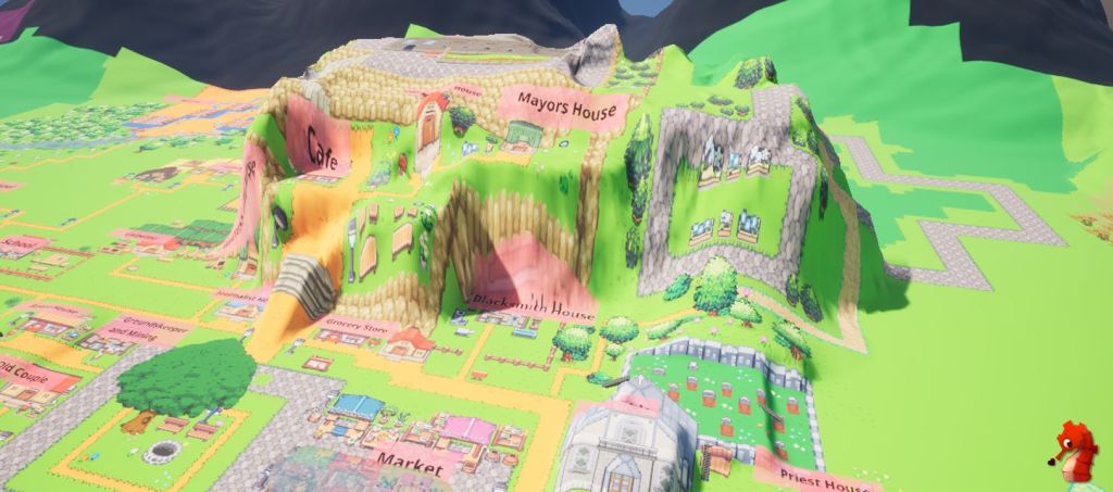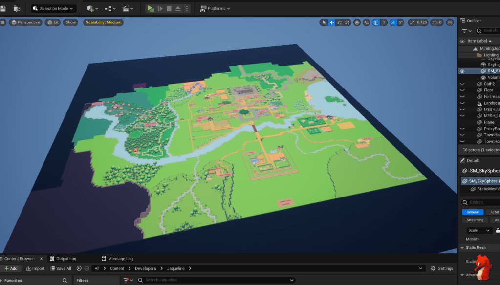 After many more hours of messing with the landscape, placing down placeholder meshes and running around, testing things out – this is the result so far this week.
