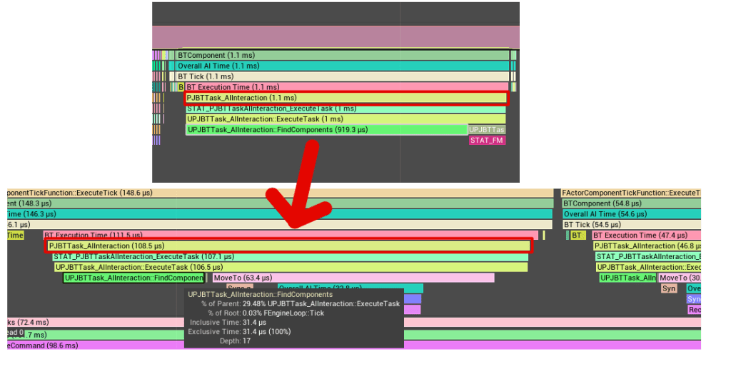 Here is one example of optimizing the AIInteraction code, taking it from about ~1ms (milliseconds) down to about ~108µs (microseconds) in the worst case I recorded.
