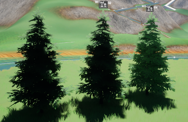 I (mostly) fixed the issue with the dark trees, that received too much shadowing from fully masked out mesh sections. But first, I had to swap to a source version of the engine because the fix required a little engine change.