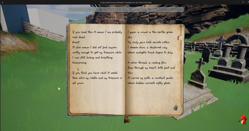 One part of this is books that the player can collect and read. These will be used for treasure hunts, but also for other in-game lore and tips and tricks that might be fun and useful for the player.