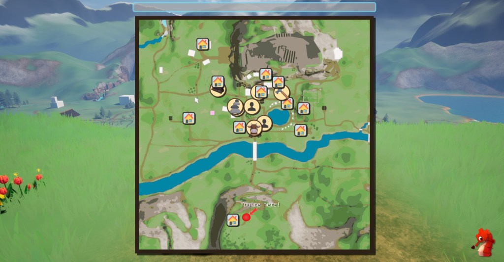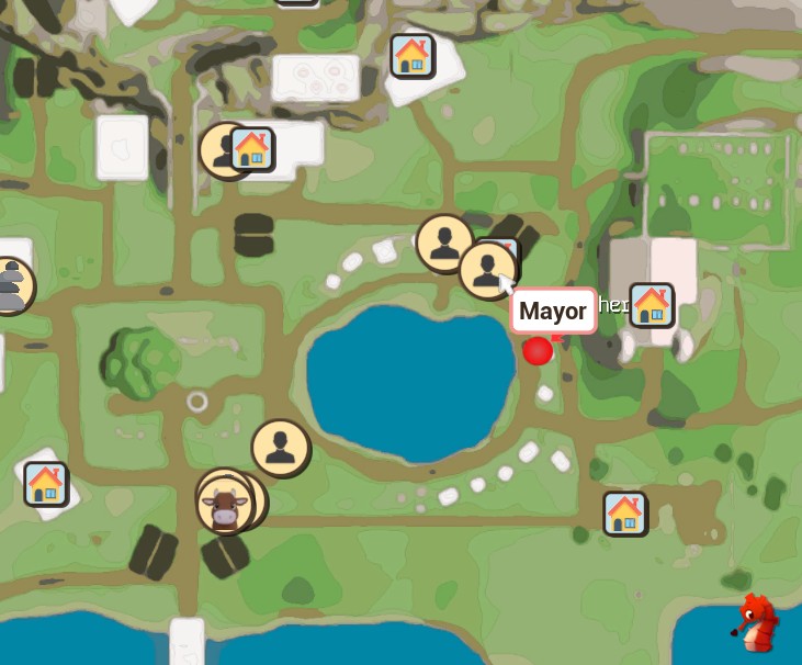 You can see we have different markers for different things in the world. The houses represent buildings of interest, such as shops or the homes of villagers. The round icons represent villagers themselves, so they are easy to find.